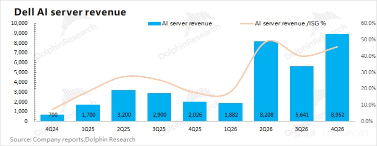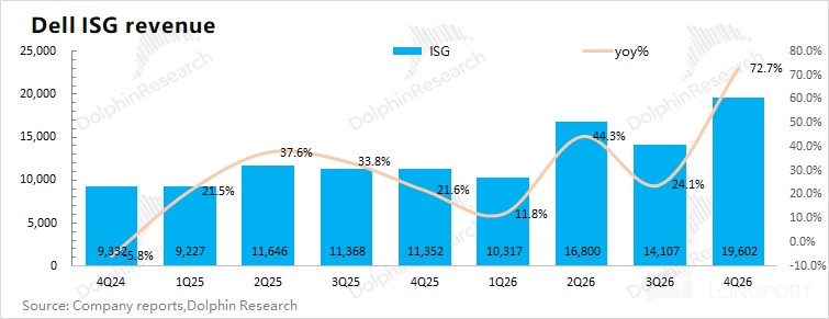 戴尔 DELL 的 ISG 业务在 2026 财年第四季度(即 25Q4)实现营收 196 亿美元,同比增长 72.7%,好于市场预期(186 亿美元)。