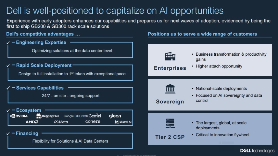 另一方面,英伟达是戴尔 AI 服务器的核心合作伙伴。在大模型的重心从 “训练转向推理” 的阶段中,ASIC 等产品将对英伟达 GPU 带来挑战。如果英伟达竞争力下滑,市场也会担心戴尔 AI 服务器的增速表现。由于公司在业务上相对更聚焦于企业级客户和主权/政府客户,有助于公司 AI 业务实现稳步增长。