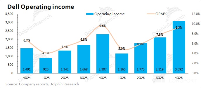 戴尔 DELL 在 2026 财年第四季度(即 25Q4)核心经营利润为 31 亿美元,同比增长 34%,本季度核心利润率提升至 9.3%。本季度利润端的增长,主要是受收入增长和利润率回升的带动。