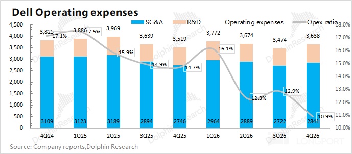 戴尔 DELL 在 2026 财年第四季度(即 25Q4)的经营费用为 36.4 亿美元,同比增长 3%。在规模效应的影响下,本季度经营费用率下降至 10.9%。