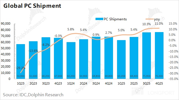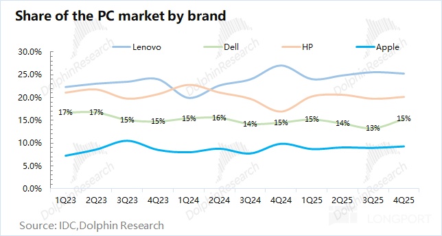 结合全球 PC 市场数据,2025 年第四季度全球 PC 出货量 7640 万台,同比增长 11%,有所回升。其中戴尔 DELL 的出货量为 1170 万台,同比增长 17%,表现好于行业平均水平,这也使得公司在 PC 市场的份额回升至 15%。