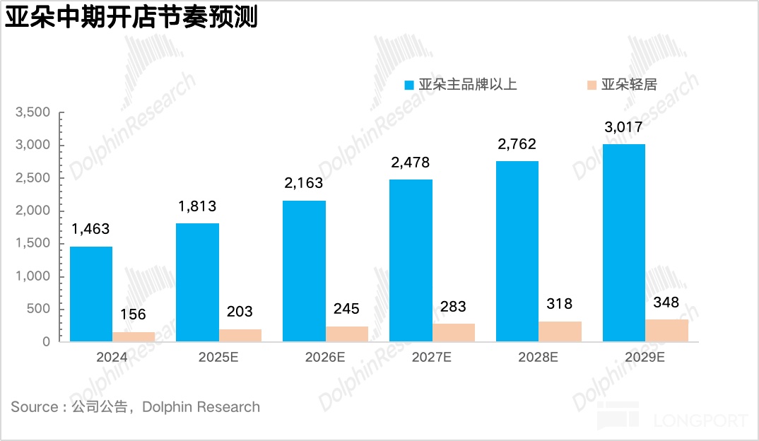 海豚君预计短期整合红利仍将持续释放,因此 2026-2027 年海豚君假设亚朵仍然保持相对较高的扩张速度巩固在中高端市场的竞争力。中期在门店数量突破 2500 家后,参考华住,海豚君假设从 2028 年开始亚朵开店进度逐步放缓,以优化现有门店结构,提高单店效率为主,具体的开店预测参考下图: