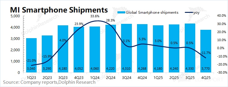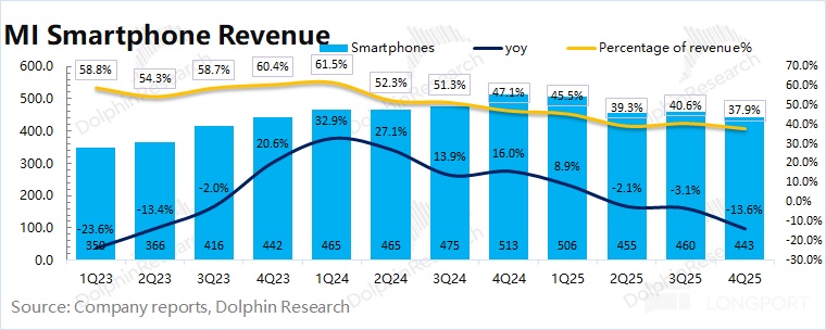 2025 年第四季度小米智能手机业务实现营收 443 亿元,同比下滑 13.6%,主要受存储涨价、国补收紧和竞争加剧的影响。