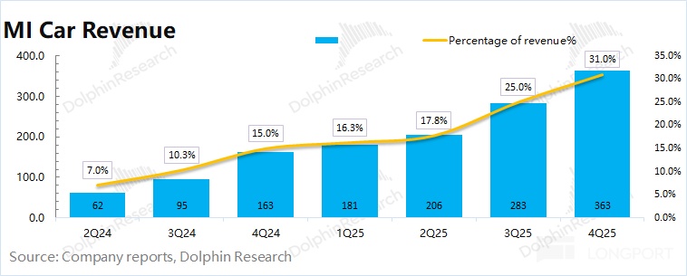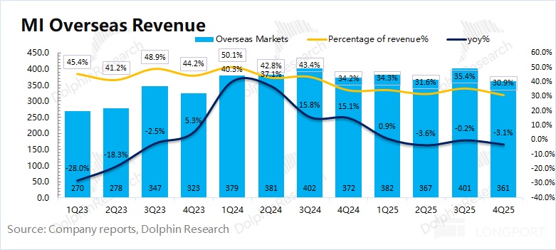 2025 年第四季度小米海外收入 361 亿元,同比下滑 3.1%。在国内汽车业务的增长之下,公司海外市场收入占比已经下滑至 31% 左右。