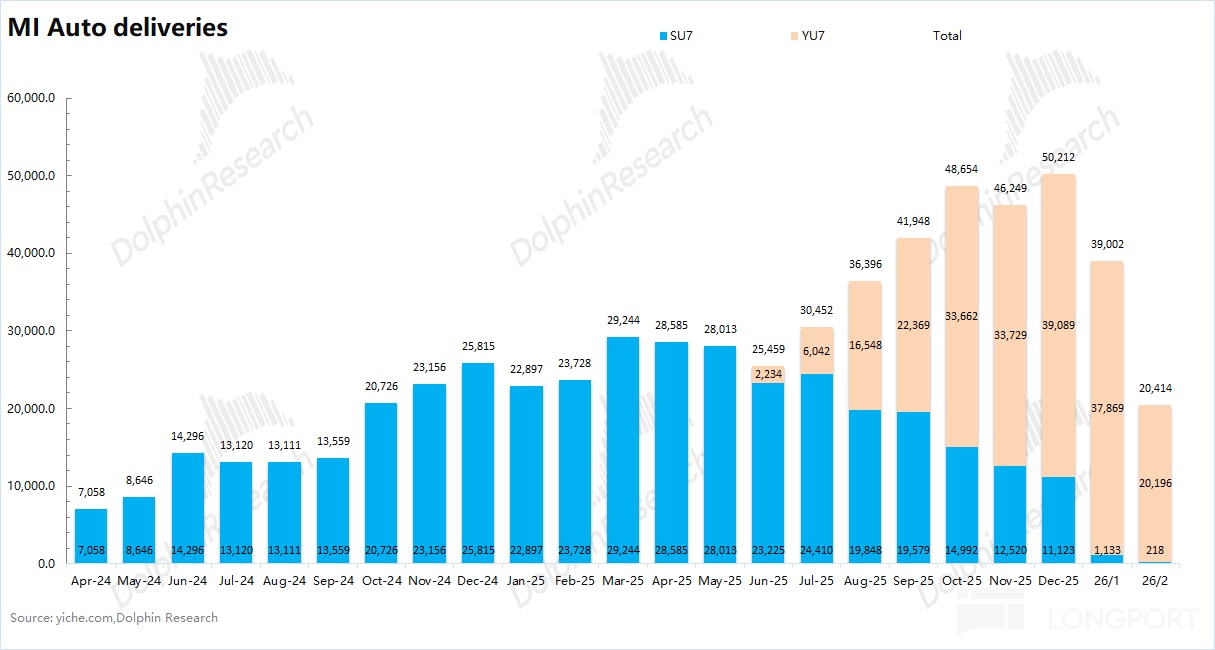 虽然小米汽车在 2025 年四季度交出了 14.5 万台的销售量,但进入 2026 年以来的前两个月,小米汽车的销售量出现了 “断崖式” 的下滑,这表明此前的 “积压” 订单基本已经被消化掉了。