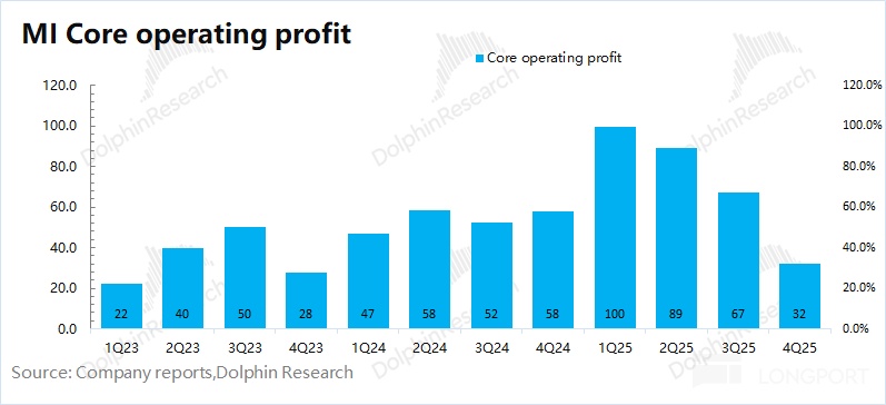 2025 年第四季度调整后净利润 63 亿,但海豚君一直以来,并不认同小米调整净利润的方式——财务收益不调出、同时自己所投资公司的股息收益不调出。但是这些即使可持续,也不算公司主营业务,无法体现盈利的长期持续能力。