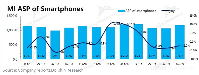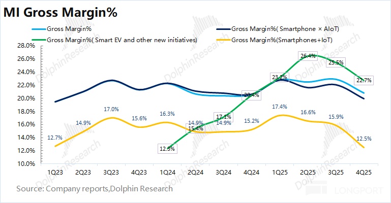 a) 小米老业务毛利率 20%,环比下滑 2.1pct,主要受国补收紧、存储涨价等影响,其中手机业务本季度下滑至 8.3%。