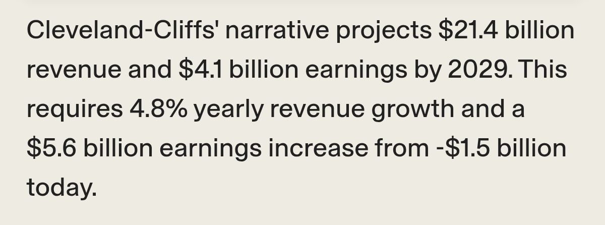 - $Cleveland Cliffs(CLF.US) ;上游原料、中游加工生產、下游物流鏈路。北美唯一的垂直整合鋼鐵商;管理層給出的數據跟目前觀察到的合約和市場份額一致,大概在 2029 年,能夠創造出不低於 40 億的現金淨利潤。如果按 10pe 給予計算的話,3 年後市值約 400 億,也就是現在價格的 8 倍。我認為我對三年八倍這個收益很滿意。
